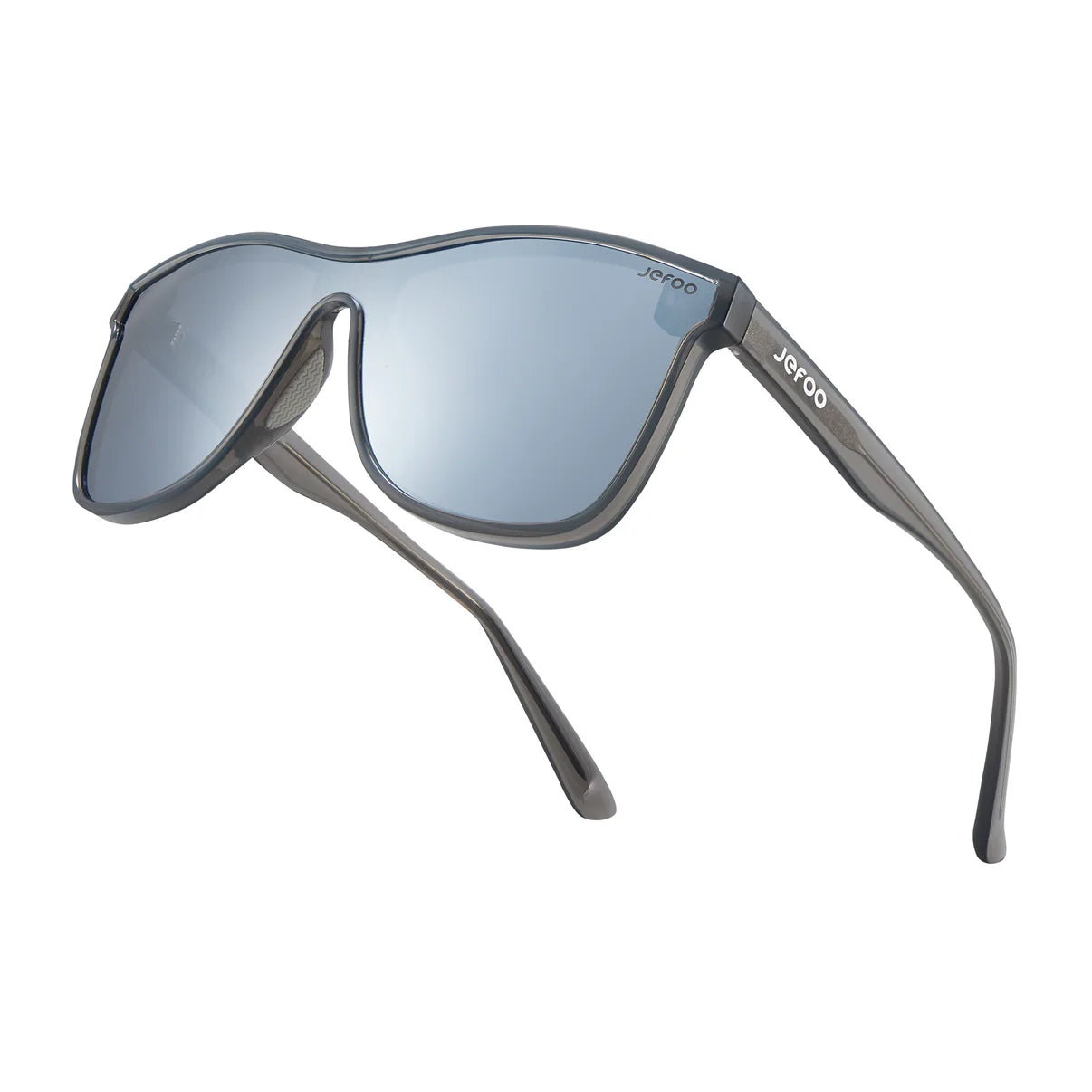 Jefoo Dynasty Silver One-Lens Sunglasses, with a TR90 frame in semi-transparent silvery gray, whisper elegance and resilience. Their oversized square silhouette melds with mirrored silver TAC lenses, casting a protective guard of UV400, shielding your eyes like a knight guarding his lord. Flexible temple tips and rubber nose pads promise all-round comfort, like the tender of a beloved orchid. Each time you wear them, they become more than an accessory; they transform into a partner, echoing the pleasing rhythm of life. In their reflection, you see not just the world, but a dance of light and shadow, as silver shades adorn your face, reminiscent of the moonlight's delicate touch on the ground.